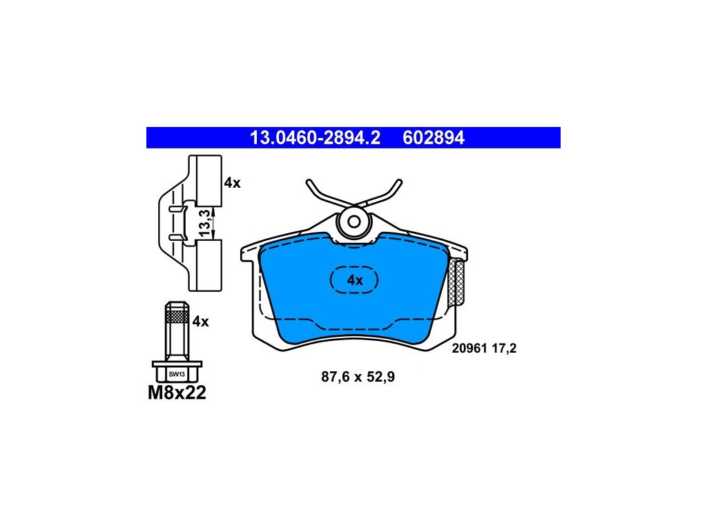 Sada ATE 13.0460-2894.2 zaručuje spolehlivý brzdný výkon a dlouhou životnost. Destičky mají rozměry šířka 87,6 mm, výška 52,9 mm a tloušťka 17,2 mm.