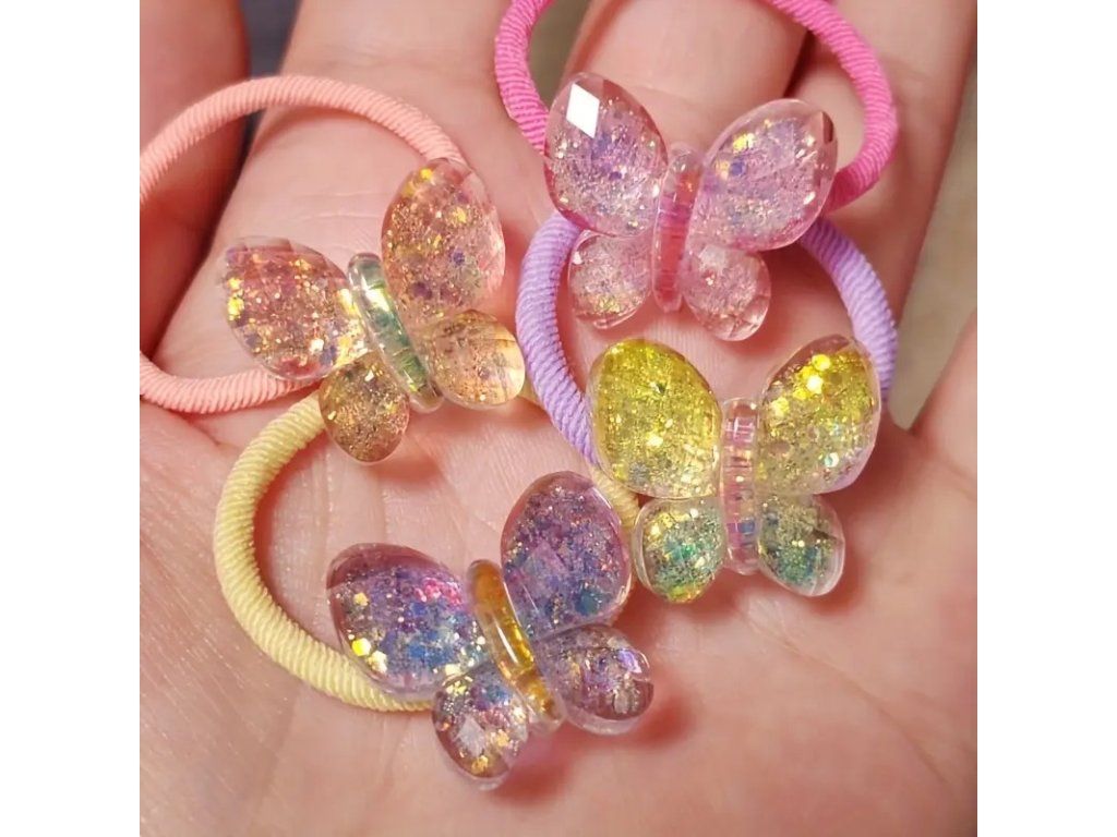 Tyto gumičky jsou stylovým a veselým doplňkem do vlasů ideálním pro každodenní nošení nebo speciální příležitosti. Jsou navrženy tak aby pevně držely vlasy a zároveň byly jemné k vlasovému vláknu. Obsah balení Sada obsahuje 5 kusů malých gumiček do vlasů. Gumičky jsou zdobeny imitací motýlů v různých barvách. Mají třpytivý efekt a gradientní barevné přechody což jim dodává jedinečný vzhled. Jsou to elastické malé gumičky (Small Hair Bands) vhodné k sepnutí menších pramenů vlasů nebo k vytváření různých účesů.