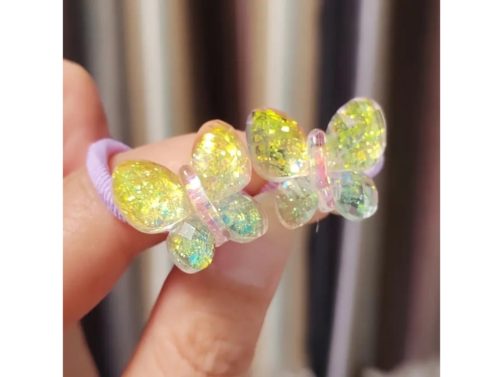 Sada obsahuje 5 malých elastických gumiček do vlasů s imitací barevných motýlů. Gumičky mají přechodové gradientní barvy a jsou zdobeny třpytkami což jim dodává živý a hravý vzhled.