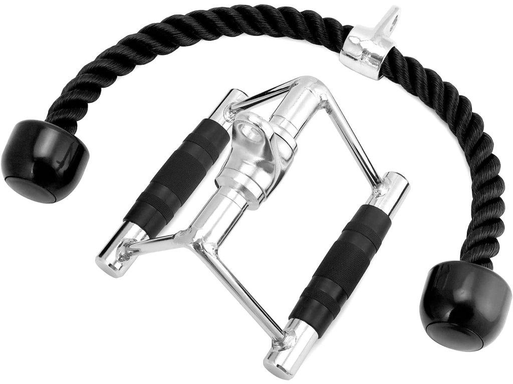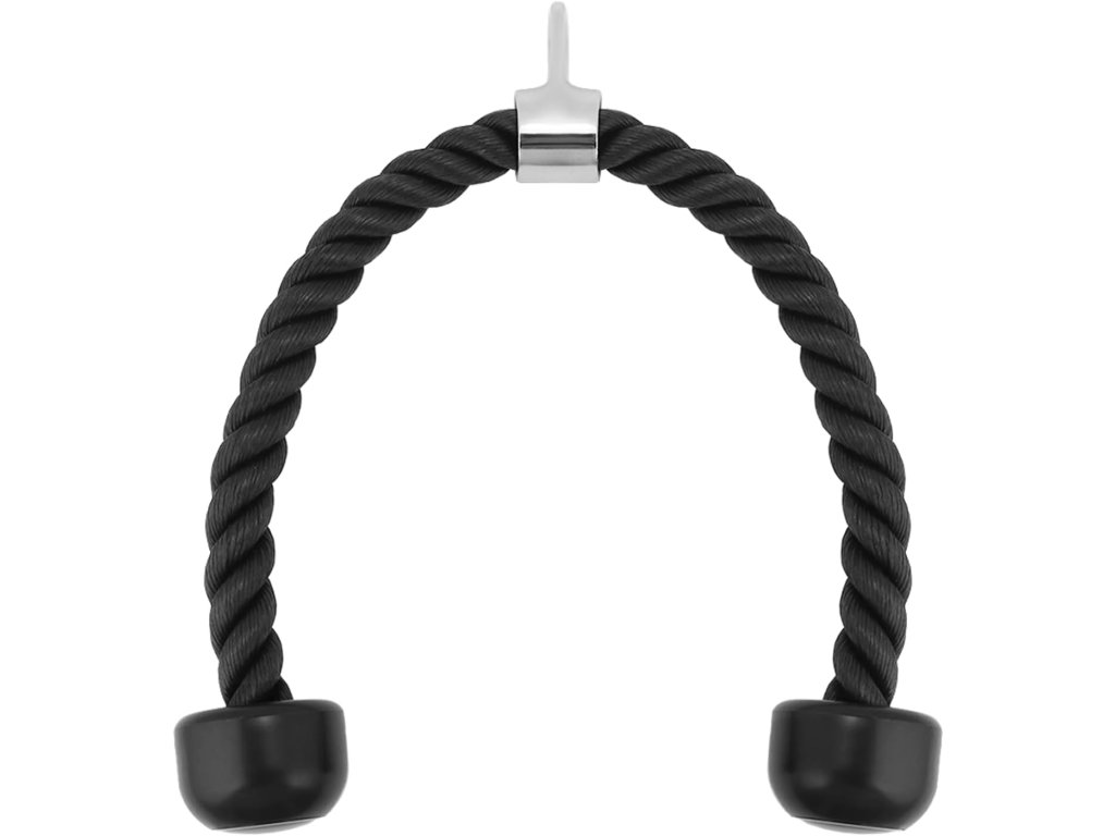 Vysoce pevné tricepsové lano: Tricepsové lano o délce přibližně 70 cm (27,5 palce) je vyrobeno z vysokopevnostního nylonového materiálu s průměrem 2,6 cm (1 palec). Je zakončeno robustním kovovým kroužkem, který se snadno připojuje k karabinám standardního fitness vybavení.
