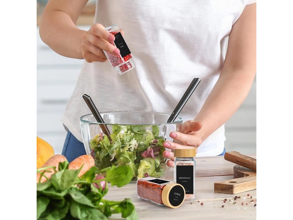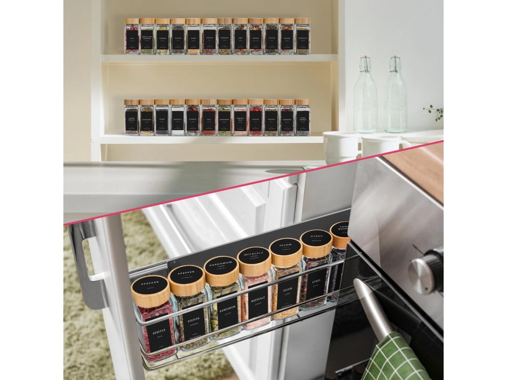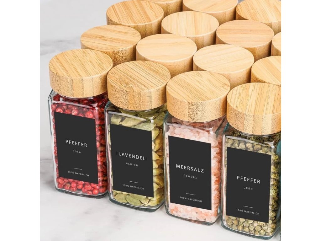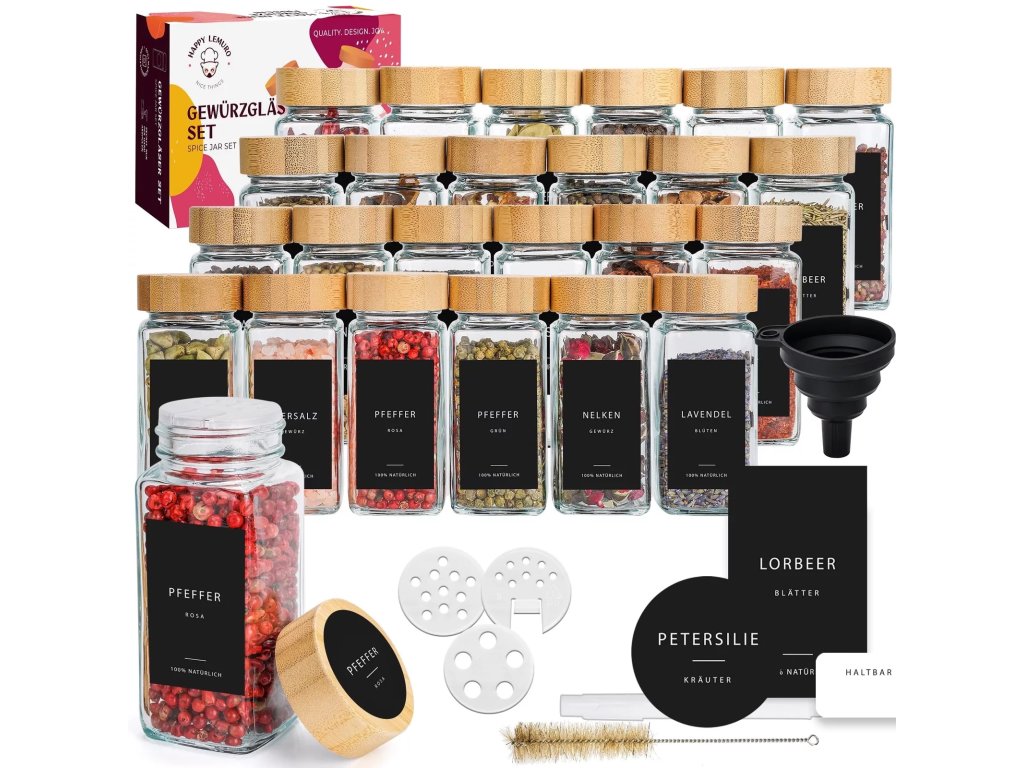 Sada 24 kusů kvalitních kořenek z robustního skla o objemu 120 ml s bambusovými víčky a třemi typy dávkovacích nástavců. Sada je dodávána s 303 etiketami v němčině pro organizaci koření a dalším praktickým příslušenstvím.