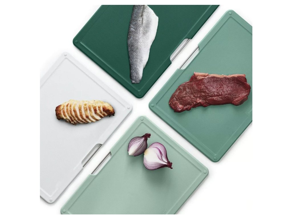 Sada čtyř oboustranných prkének v elegantním stojanu. Prkénka mají odlišné barvy, které pomáhají udržet hygienu při přípravě jídla. Zvýšené okraje zabraňují stékání šťávy a jsou vhodná do myčky.