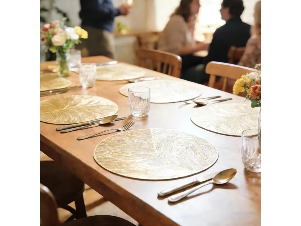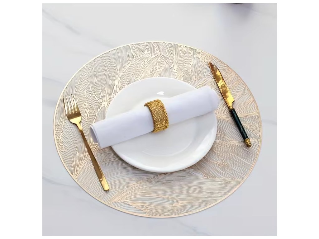 Podložky na stůl v minimalistickém, ale luxusním provedení jsou vyrobeny z odolného PVC materiálu, který vyniká svou tepelnou odolností a dlouhou životností. Díky unikátnímu designu s motivem zlatých listů se stanou výrazným dekorativním prvkem každé jídelny, kuchyně nebo slavnostně prostřené tabule při oslavách a večírcích. Materiál je zcela nepromokavý, což zajišťuje dokonalou ochranu povrchu stolu před rozlitými tekutinami a mastnotou.