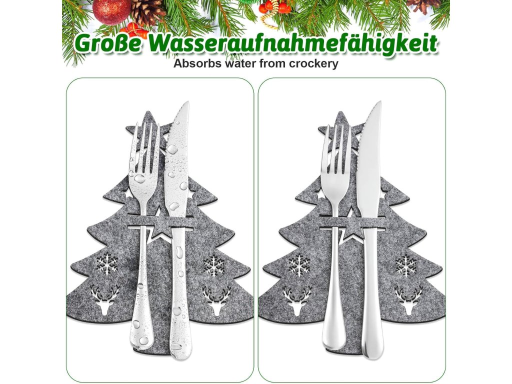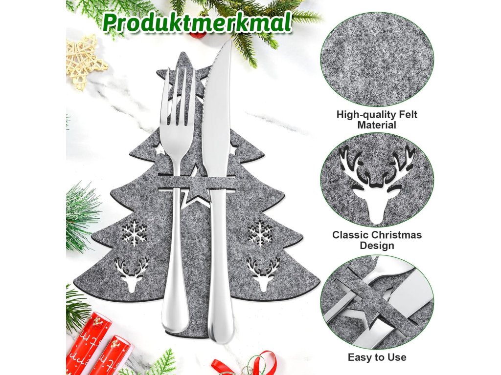 Vánoční držáky na příbory značky Vevoqim jsou ideálním doplňkem pro slavnostní stolování. Sada obsahuje 20 kusů pouzder, což poskytuje dostatečnou kapacitu pro pohoštění celé rodiny i hostů na vánočním večírku. Každý držák je vyroben z vysoce kvalitní plsti, která je měkká na dotek, působí hřejivým dojmem a zároveň dokáže absorbovat zbytkovou vlhkost z povrchu nádobí. Šedá barva v kombinaci s jemným designem snadno ladí s různými styly ubrusů a prostírání.