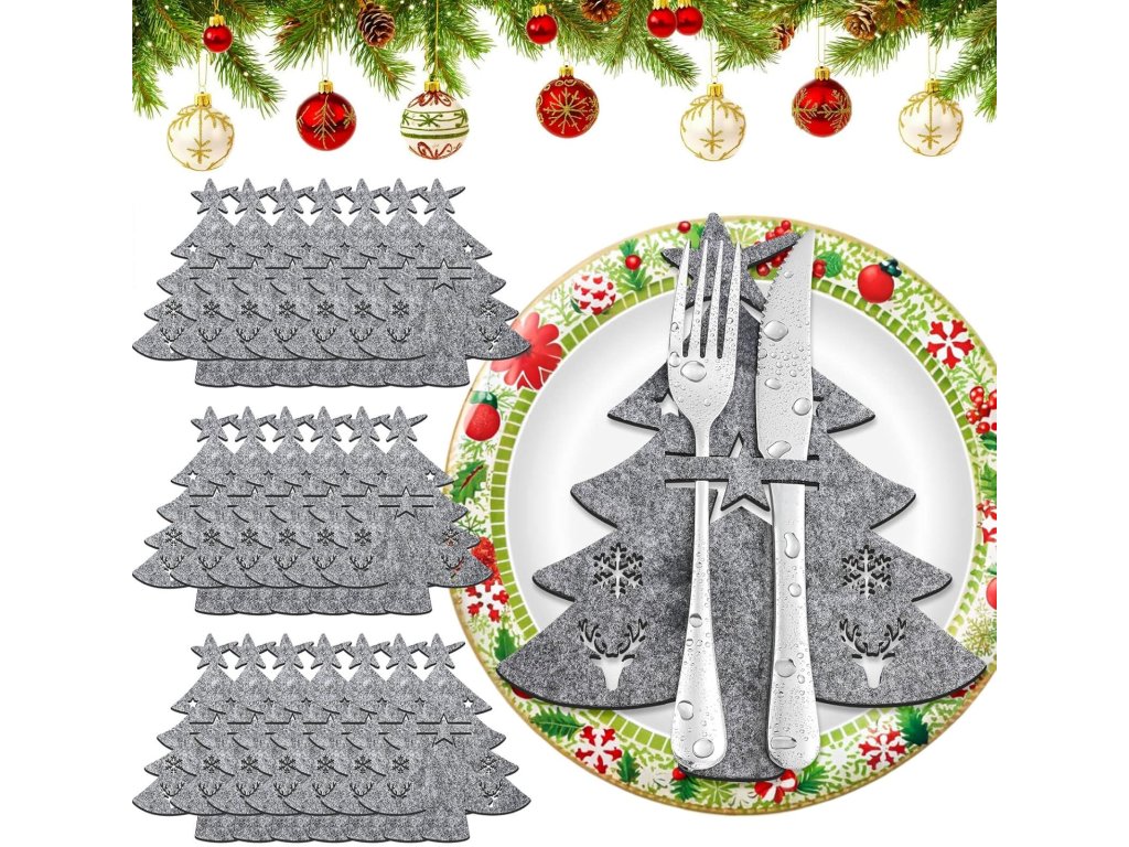 Sada plstěných držáků na příbory ve tvaru vánočního stromku 20 kusů šedá