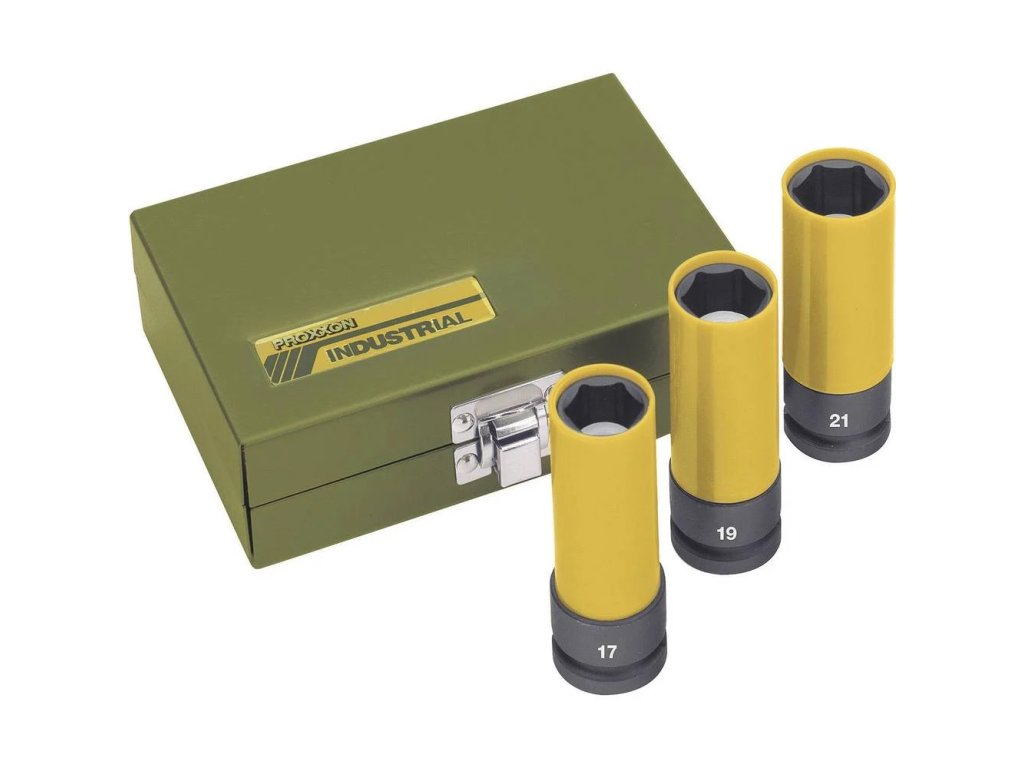 Tato sada rázových nástrčných klíčů Proxxon Industrial IMPACT obsahuje 3 klíče ve velikostech 17, 19 a 21 mm s 1/2" pohonem. Klíče jsou vyrobeny z vysoce legované speciální oceli a jsou vybaveny plastovým pouzdrem, které chrání hliníkové ráfky před poškozením.