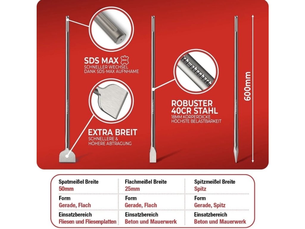 Tato sada sekáčů od značky Schwabenbach obsahuje tři kusy s uchycením SDS Max. Sekáče mají délku 600 mm a jsou určeny pro práci s tvrdými a houževnatými materiály.