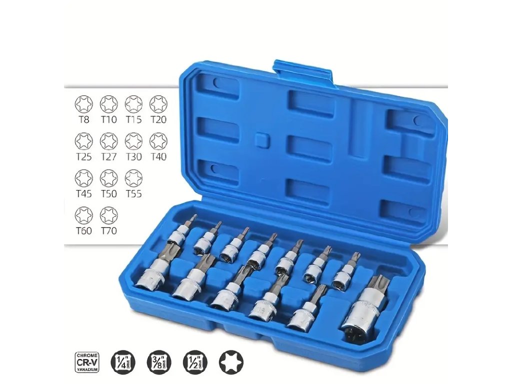 Tahle sada obsahuje 13 různých bitů (to jsou takové šroubovací nástavce) s hvězdičkovým tvarem, kterým se říká Torx. Jsou vyrobené z pevné oceli, takže by měly vydržet. V sadě najdeš velikosti od T7 až po T40, takže se ti budou hodit na spoustu věcí, kde se používají takové speciální šrouby. Mají i modrou rukojeť, abys je mohl/a dobře držet, a celé je to uložené v praktickém pouzdře, takže v tom budeš mít pořádek a nic neztratíš.