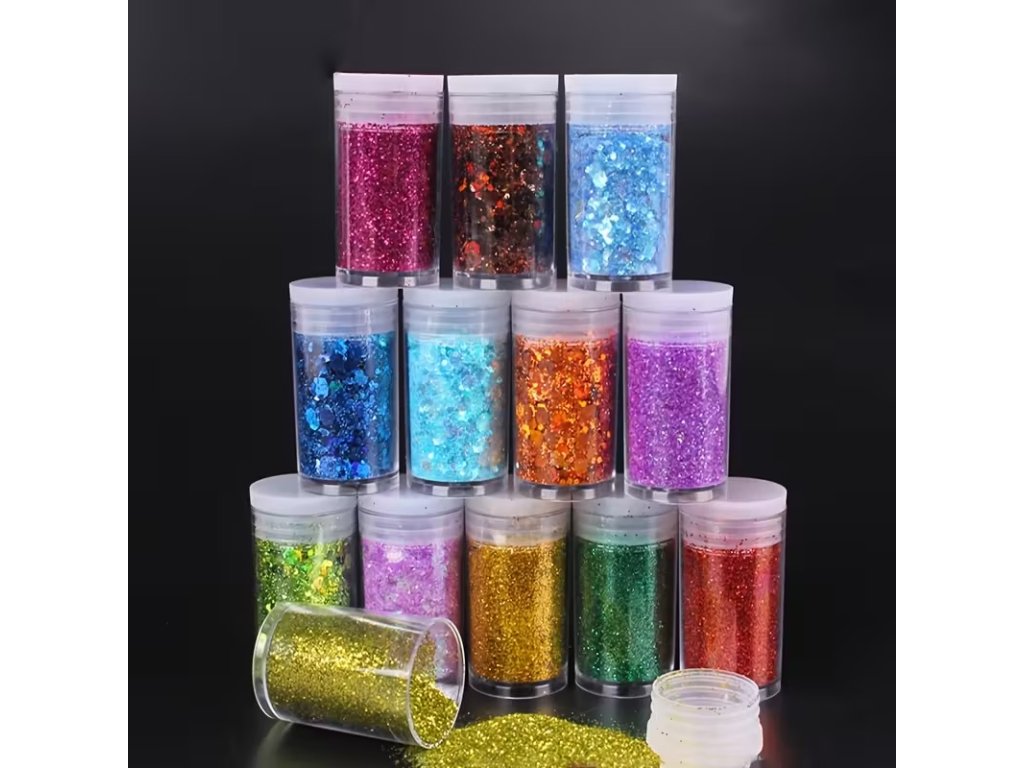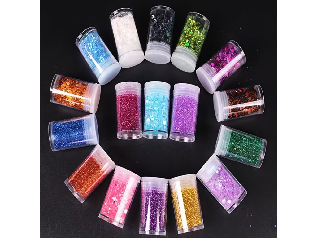 Balení: Třpytky jsou dodávány v praktických, uzavíratelných nádobkách, které usnadňují skladování a zabraňují nechtěnému rozsypání.