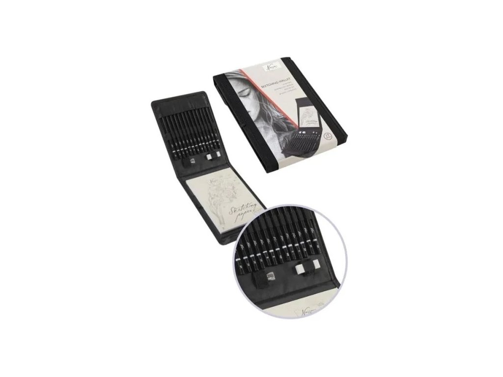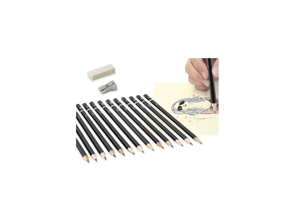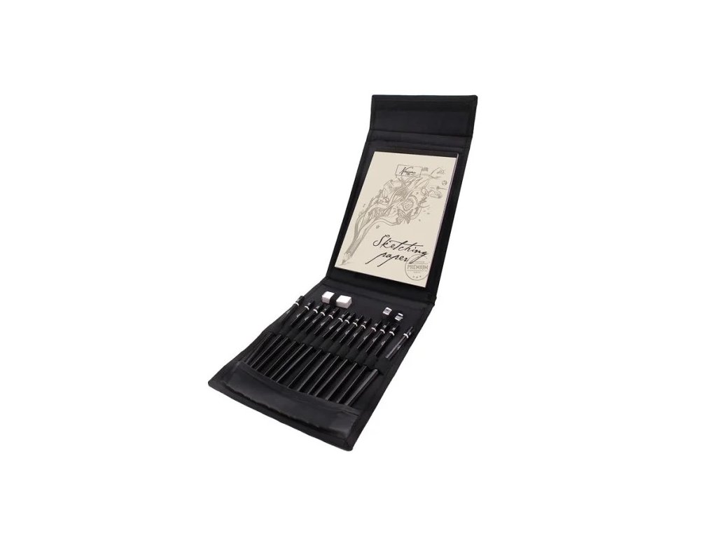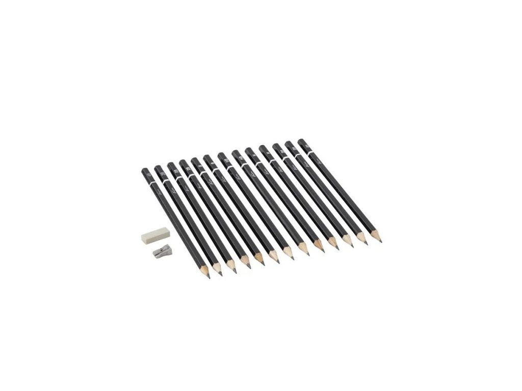 17dílná sada tužek na kreslení: 13 grafitových tužek (různé tvrdosti), zápisník, ořezávátko, guma, látkové pouzdro. Ideální pro různé kreslicí techniky.