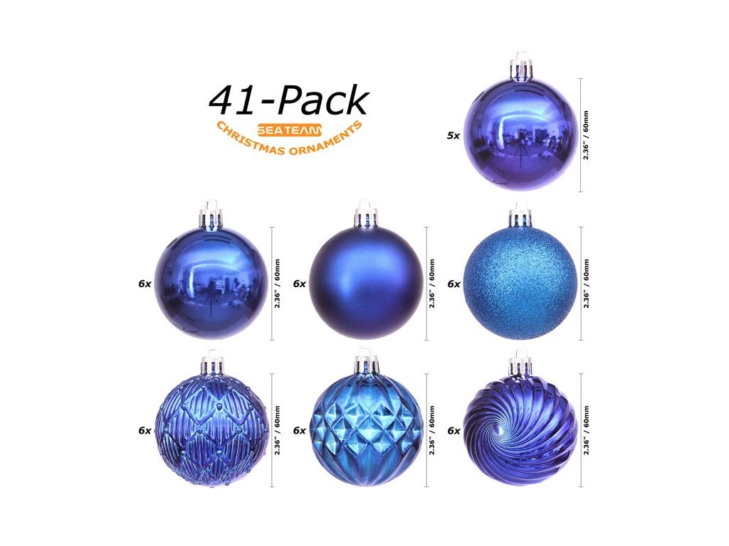 Sada vánočních ozdob značky Sea Team přináší klasický vzhled v moderním a praktickém provedení. Balení obsahuje 41 kusů baněk v modré barvě s různými typy povrchových úprav, které dodají vánočnímu stromku hloubku a rozmanitost. Mezi povrchy naleznete lesklé, matné, třpytivé i fasetované úpravy, které společně vytvářejí harmonický celek. Průměr 60 mm je univerzální střední velikost, která se skvěle hodí pro malé, střední i velké stromky, stolní dekorace nebo výrobu adventních věnců.