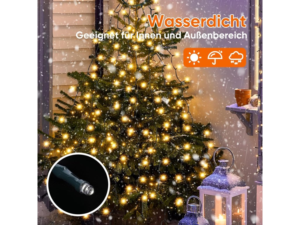 Osvětlení disponuje 24V bezpečnostním napájecím zdrojem a 5 metrů dlouhým přívodním kabelem, který usnadňuje zapojení do sítě. Použitý měděný drát je vysoce kvalitní a recyklovatelný. Zařízení nabízí celkem 9 různých režimů provozu, včetně vlnění, sekvenčního spínání, pomalého stmívání nebo stálého svícení. Díky voděodolnému provedení IP44 lze řetěz bezpečně umístit na venkovní jehličnany, terasy či fasády, přičemž napájecí zdroj je nutné uchovávat v suchu.