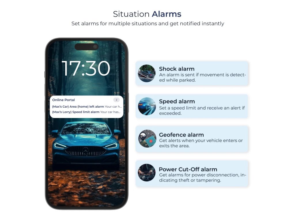Upozornění: Okamžité alarmy při překročení rychlosti, otřesech nebo odpojení napájení.
