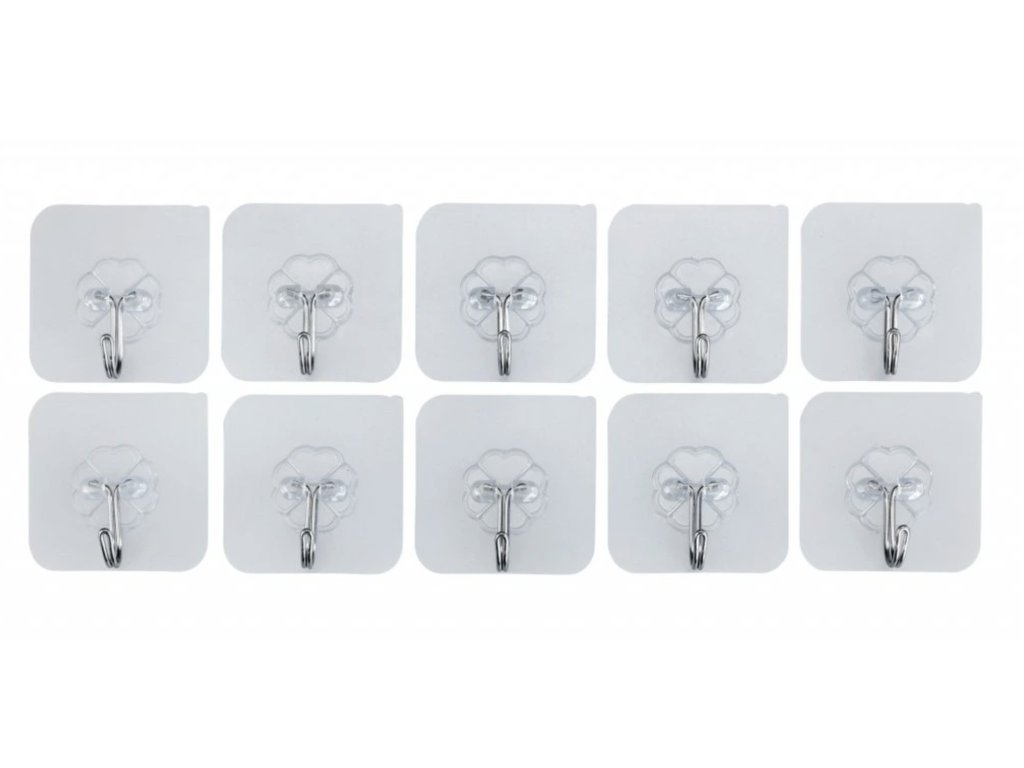 Praktická sada 10 samolepicích háčků. Vyrobeny z odolné nerezové oceli a s průhledným designem, takže nenaruší vzhled vaší koupelny či jiného prostoru. Snadná instalace bez vrtání. Rozměry jednoho háčku jsou 2 x 6 x 6 cm. Ideální pro zavěšení ručníků, utěrek, kuchyňského náčiní a dalších lehkých předmětů.