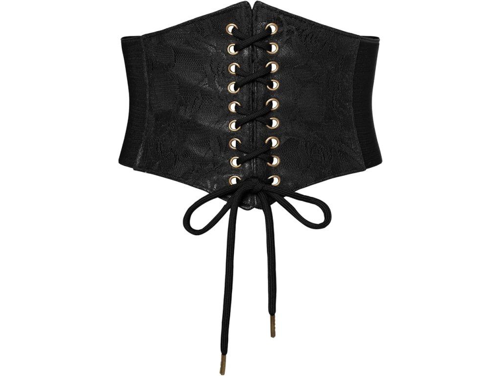 Černý široký pásek s krajkou a šněrováním vpředu dodá outfitu originální retro a steampunk nádech. Elastické provedení pomáhá pohodlnému usazení v pase a zvýrazní siluetu.