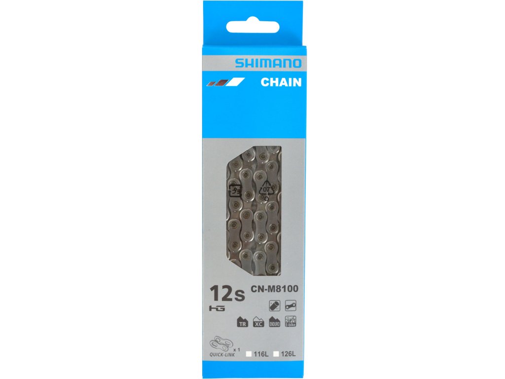 Řetěz Shimano XT CNM8100 je navržen pro maximální spolehlivost a plynulý chod v 12rychlostních systémech, a to jak pro klasická kola, tak i pro Ebike. Určen pro 12rychlostní pohony (12s). Kompatibilní s MTB (1x12 a 2x12) DURA ACE ULTEGRA 105 (2x12) a GRX (1x12 a 2x12). Vhodný pro Ebike (např. MTB EP8 EP800 Trekking STEPS E8080). Technologie a konstrukce QuickLink SMCN91012 pro snadné spojení. Speciální design zajišťuje lepší uchycení řetězu k zubům kazety a převodníku a zlepšuje výkon řazení. Desky čepu a váleček jsou opatřeny povlakem SILTEC pro delší životnost a hladší chod. Model: CNM8100 Typ: HG Přední převod: 1/2-speed Zadní převod: 12-speed Dutý čep (Hollow Pin): Ne. Hmotnost je přibližně 252 g pro variantu se 116 články. Dostupné varianty délky jsou 116 126 a 138 článků.