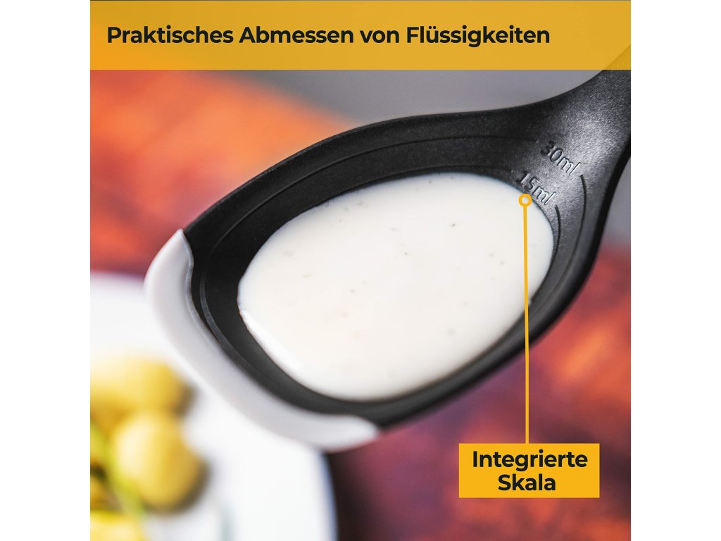 Tato 5dílná kuchyňská sada od značky Silberthal je dokonalým univerzálním řešením pro vaši kuchyni. Kombinuje elegantní černý design s praktickými funkcemi, které usnadní vaření a zároveň ochrání vaše nádobí. Sada obsahuje nástroje s integrovanou měrkou pro přesné odměřování omáček a chytrou silikonovou hranou, která zajistí perfektní čistotu pánví a hrnců bez poškrábání.