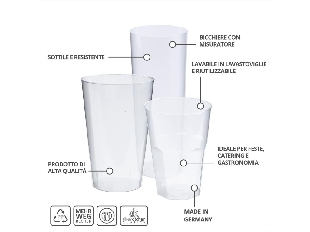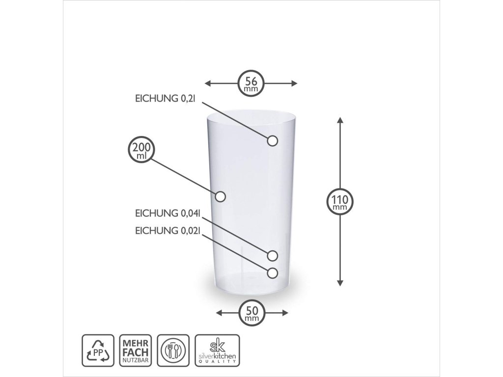 Silverkitchen 40 long drink sklenic - ideální pro každou příležitost: Tato sada obsahuje 40 víceúčelových long drink sklenic o objemu 200 ml. Jsou vyrobeny z kvalitního plastu (polypropylenu), stejného materiálu jako opakovaně použitelné kelímky, ale s mírně tenčí stěnou. Tyto sklenice jsou lehké, praktické a stohovatelné, což usnadňuje jejich skladování a manipulaci.
