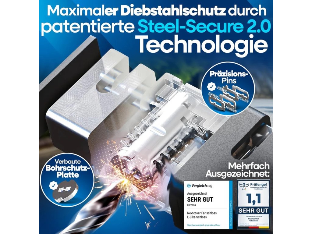 Se svou pokročilou technologií SteelSecure 2.0 a integrovanou ochrannou deskou proti vrtání tento skládací zámek účinně zabraňuje vypáčení a odvrtání. Vám i vašemu kolu tak poskytuje maximální ochranu proti krádeži. S bezpečnostní úrovní 13/15 se řadí mezi vysoce spolehlivé zámky.
