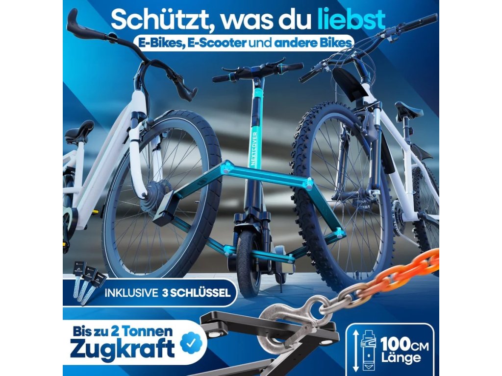 Díky své působivé délce 100 cm je zámek ideální pro vaše městské kolo, e-koloběžku nebo dokonce jako zámek pro e-bike. Tři klíče, které jsou součástí dodávky, vám zajistí dodatečnou flexibilitu a jistotu.