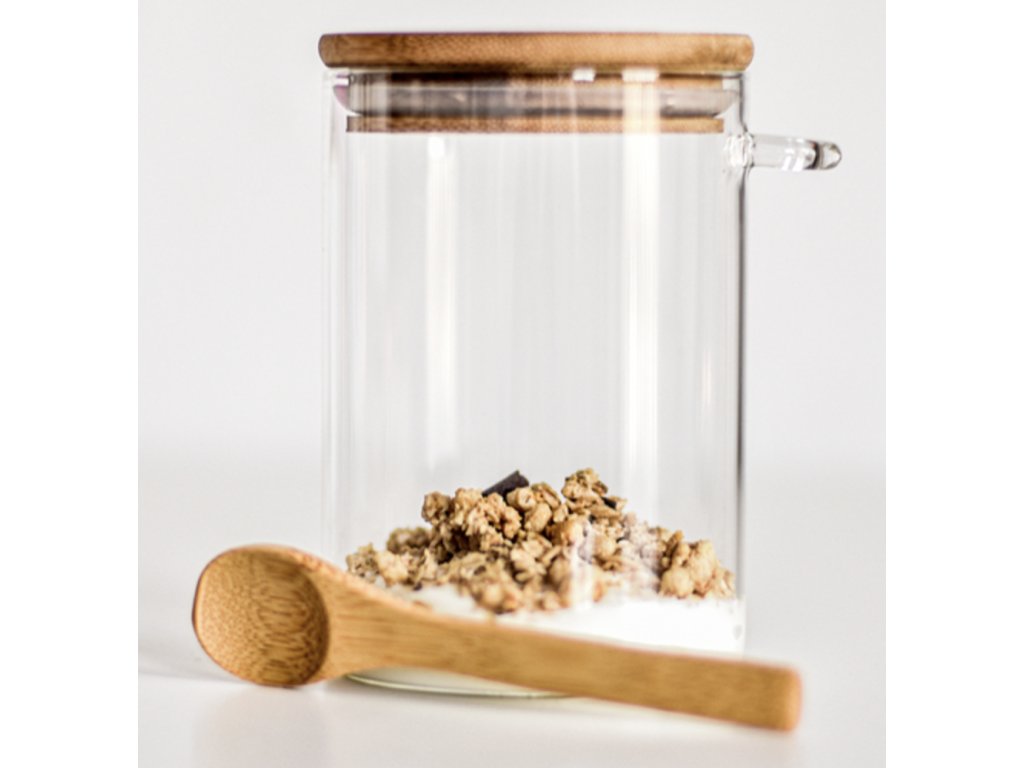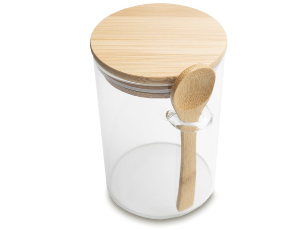 Přírodní bambusové doplňky: Součástí dózy je elegantní bambusové víčko a praktická bambusová lžička. Bambus je udržitelný a ekologický materiál, který dodává dóze přírodní a teplý vzhled.