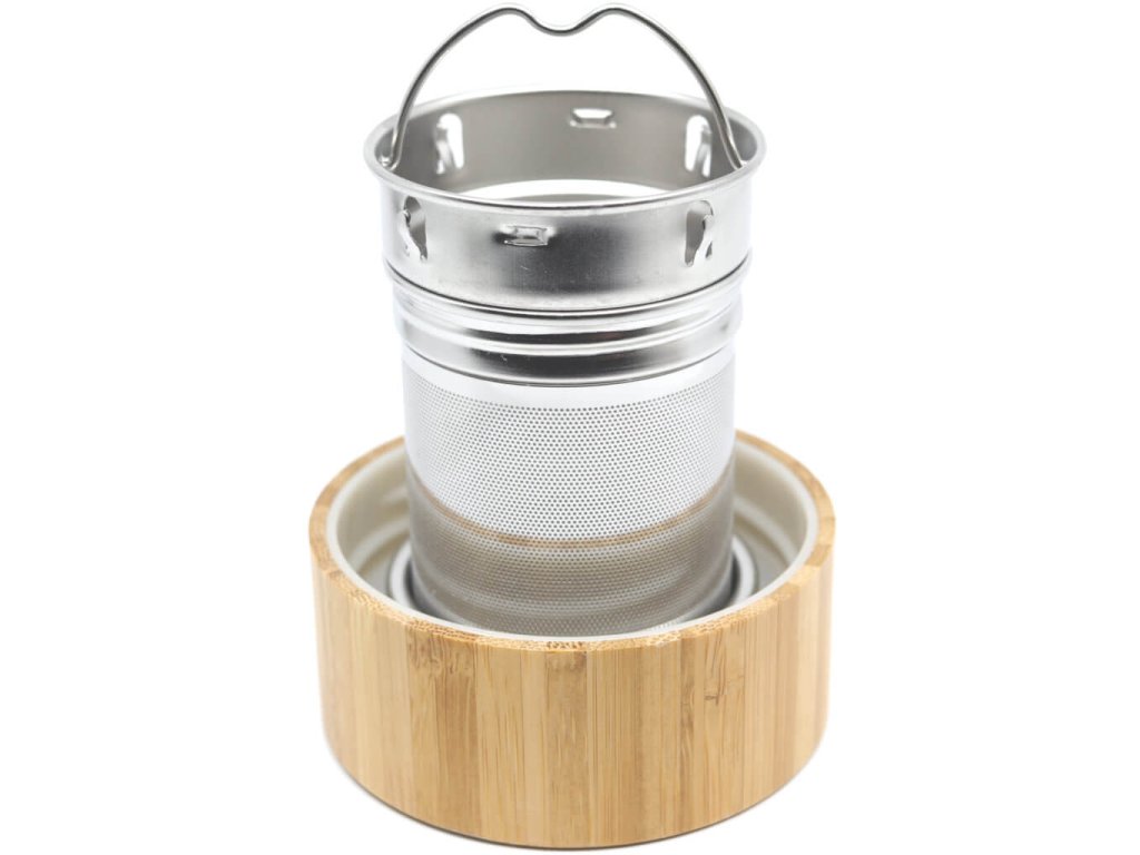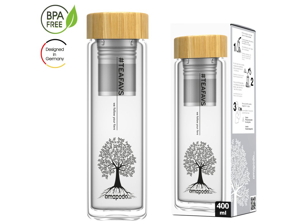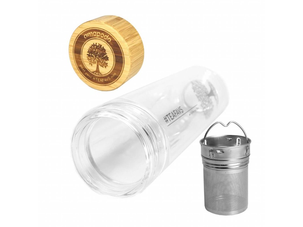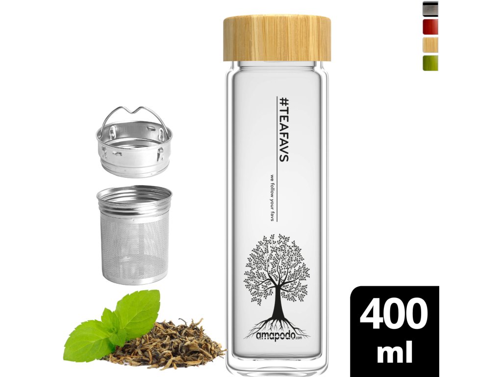 Skleněná láhev na čaj se sítkem 400ml dvoustěnná bambusové víčko