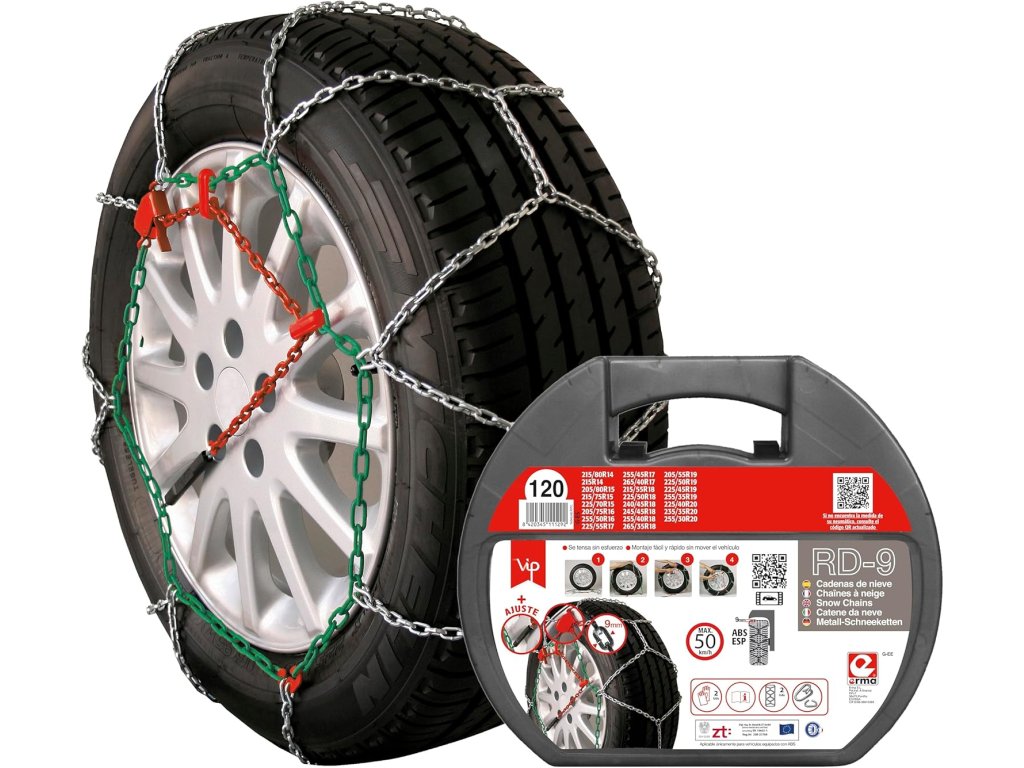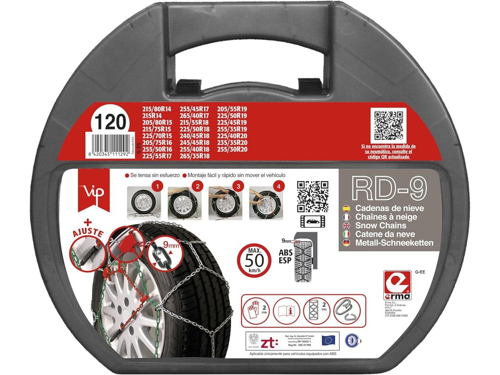 Sada 2 kusů sněhových řetězů RD9 s označením 0842034511129, velikost 120. Řetězy mají 9mm články se samouzamykací sponou a gumovým napínákem pro snadnou a pevnou montáž. Zinková úprava zajišťuje odolnost proti korozi. Součástí balení jsou také rukavice a opravná sada. Splňují evropskou normu EN 16662-1. Balení obsahuje návod k použití a QR kód s montážními videi.
