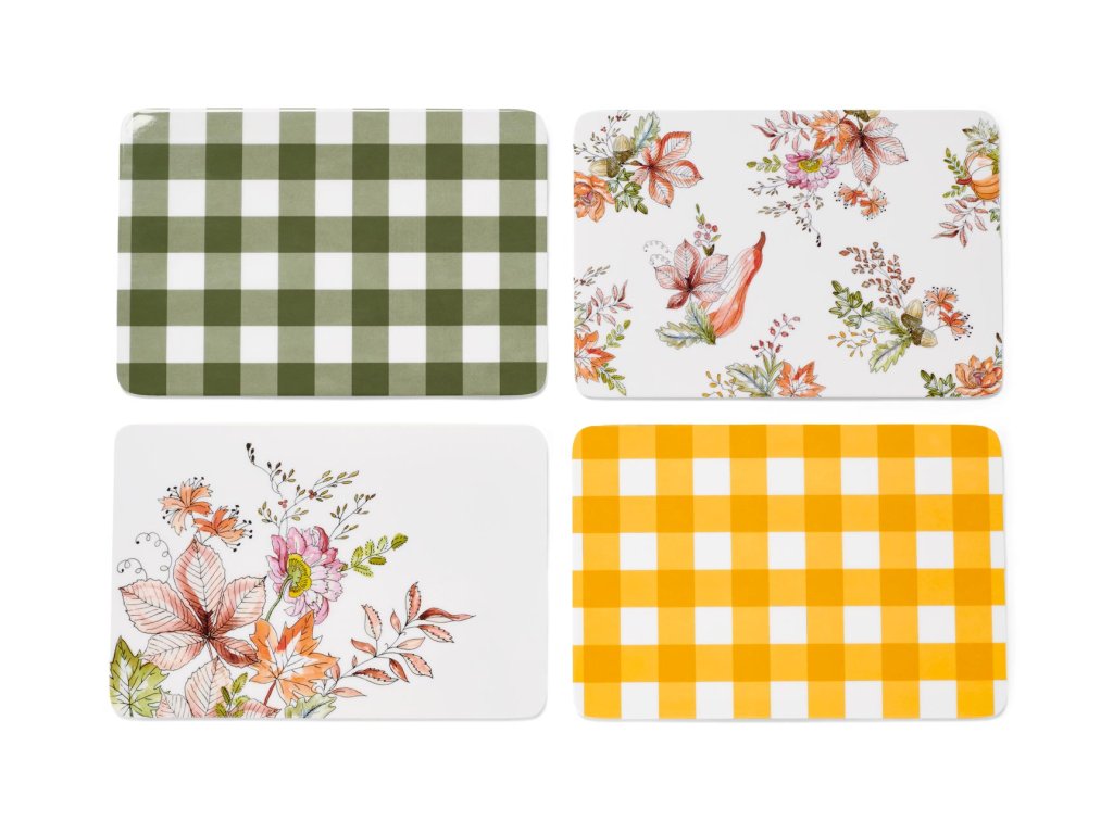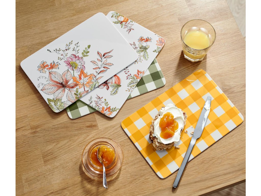 Tato sada obsahuje 4 praktická snídaňová prkénka vyrobená z tvarově stálého melaminu. Každé prkénko má jiný design: žlutou kostku, tmavě zelenou kostku a dva bílé podklady s barevnými květinovými potisky. Prkénka jsou hygienická, snadno se čistí v myčce nádobí (do 50 °C) a byla externě testována na škodlivé látky. Rozměry každého prkénka jsou cca 23,5 x 16 cm a tloušťka materiálu je cca 3 mm. Hmotnost jednoho prkénka je přibližně 160 g.