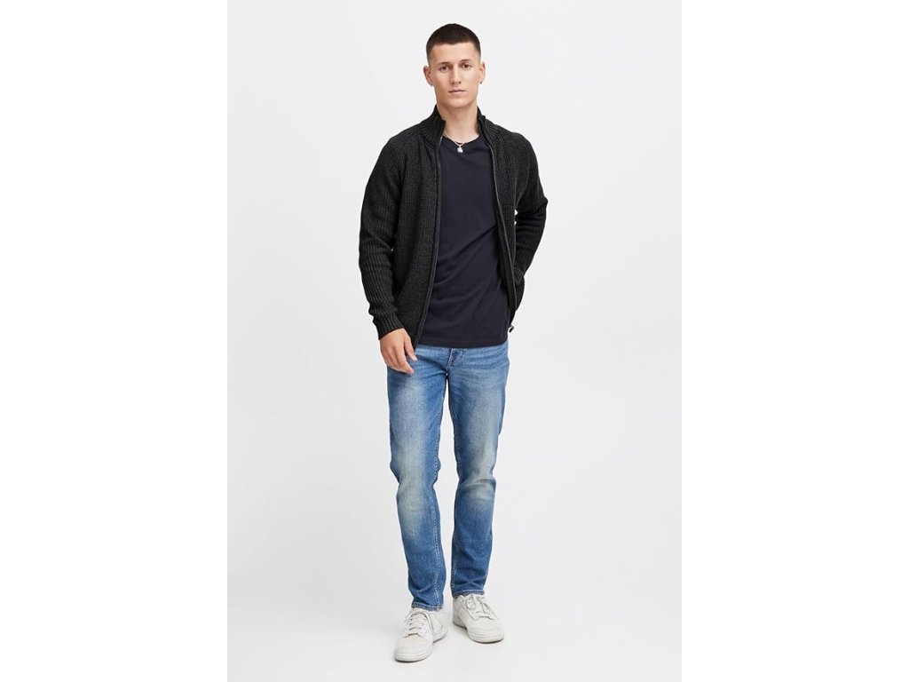 Model má regular fit střih, který dobře sedí a zároveň umožňuje volnost pohybu. Kardigan je vybaven vysokým stojáčkem a zapínáním na zip, takže jej lze nosit otevřený nebo zapnutý podle potřeby.