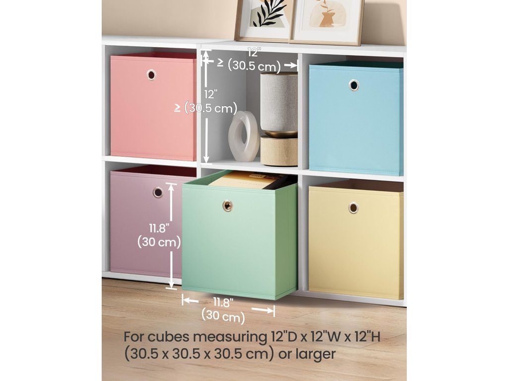 Rozměry: Boxy mají rozměry 30 x 30 x 30 cm a jsou navrženy tak, aby pasovaly do běžných kubických úložných systémů (vhodné pro police s hloubkou 30,5 cm a více).