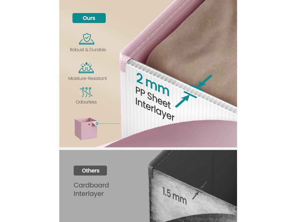 Kvalitní materiály: Konstrukce je tvořena 2 mm silnými, vlhkosti odolnými a pachově neutrálními PP deskami (polypropylen) a potažena netkanou textilií. Tyto materiály zaručují dlouhodobou stabilitu a odolnost.