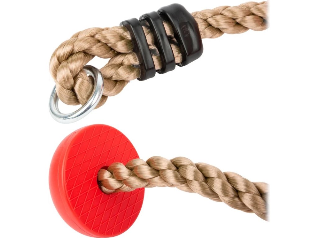 Snadná instalace: Lano je vybaveno pevným kovovým kroužkem pro zavěšení, což usnadňuje jeho rychlou a bezpečnou instalaci na vhodné konstrukce, jako jsou houpačky, rámy na šplhání nebo pevné větve stromů.