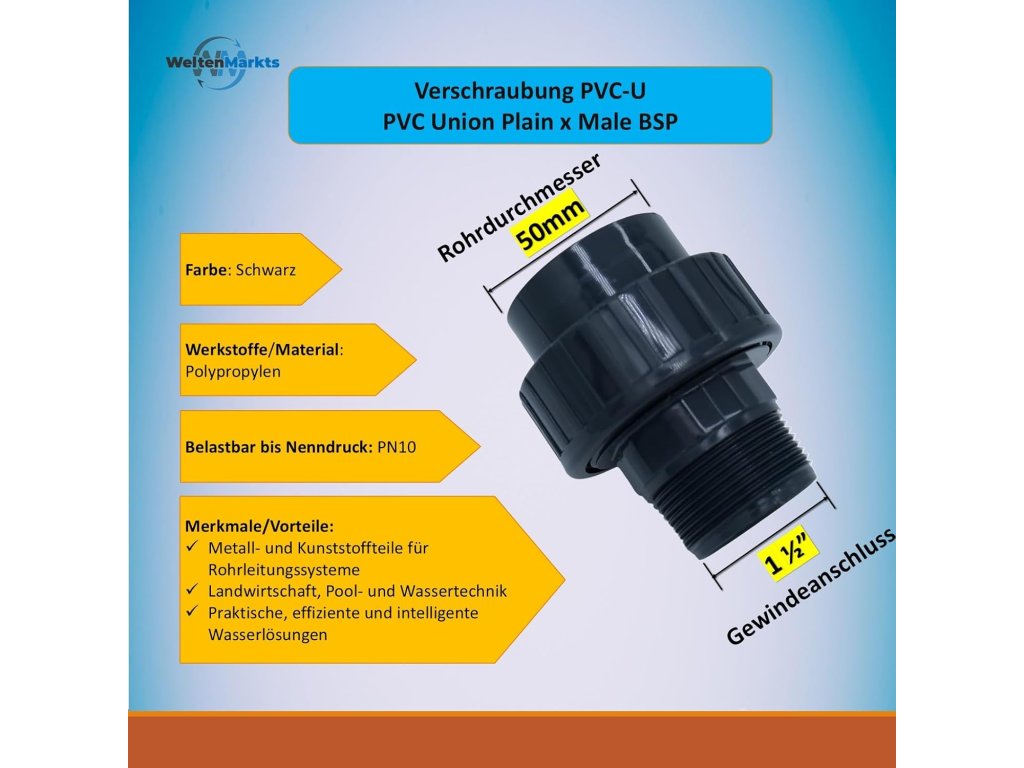 Odolná spojka PVC U značky WeltenMarkt je navržena pro bezpečné a spolehlivé spojení v potrubních systémech. S rozměry 50 mm x 1 1/2 palce a tlakovou odolností 10 bar je ideální pro různé instalace, ať už nad zemí, nebo pod ní.