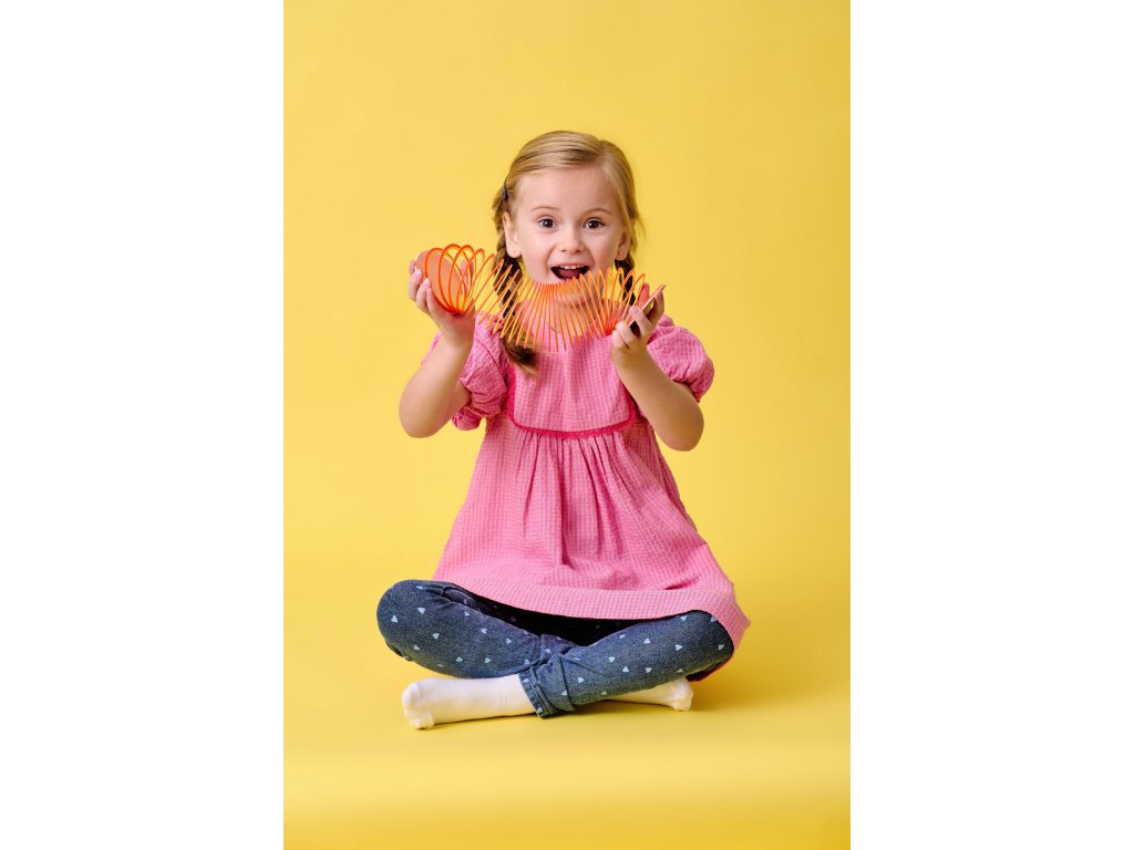 Vraťte se do dětství s pružinovou hračkou Springie Thingie! Tato oblíbená klasika stále baví. Stačí ji lehce postrčit a sledovat, jak "kráčí" dolů po schodech. Zároveň představuje zábavnou výzvu pro rozvoj zručnosti a koordinace. V nabídce jsou 3 roztomilé "snackové" postavičky: pizza, donut a kiwi, všechny s barevnou dvoubarevnou pružinou a bezpečně zakončenými konci. Vyrobeno z odolných materiálů ABS a PVC.