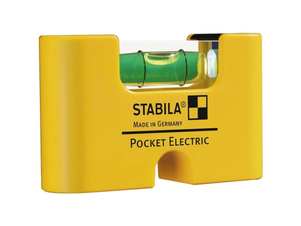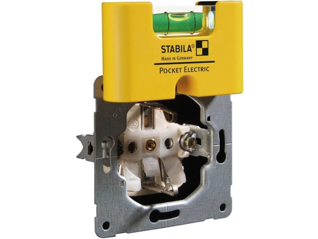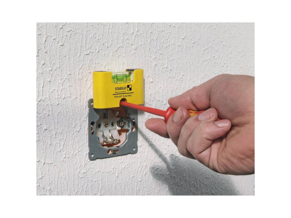 Stabila Pocket Electric je kompaktní plastová mini vodováha o délce 70 mm a přesnosti 1 mm/m. Je vybavena silným magnetem na zadní straně a výřezem pro šroubovák, což usnadňuje horizontální vyrovnávání vypínačů a zásuvek.