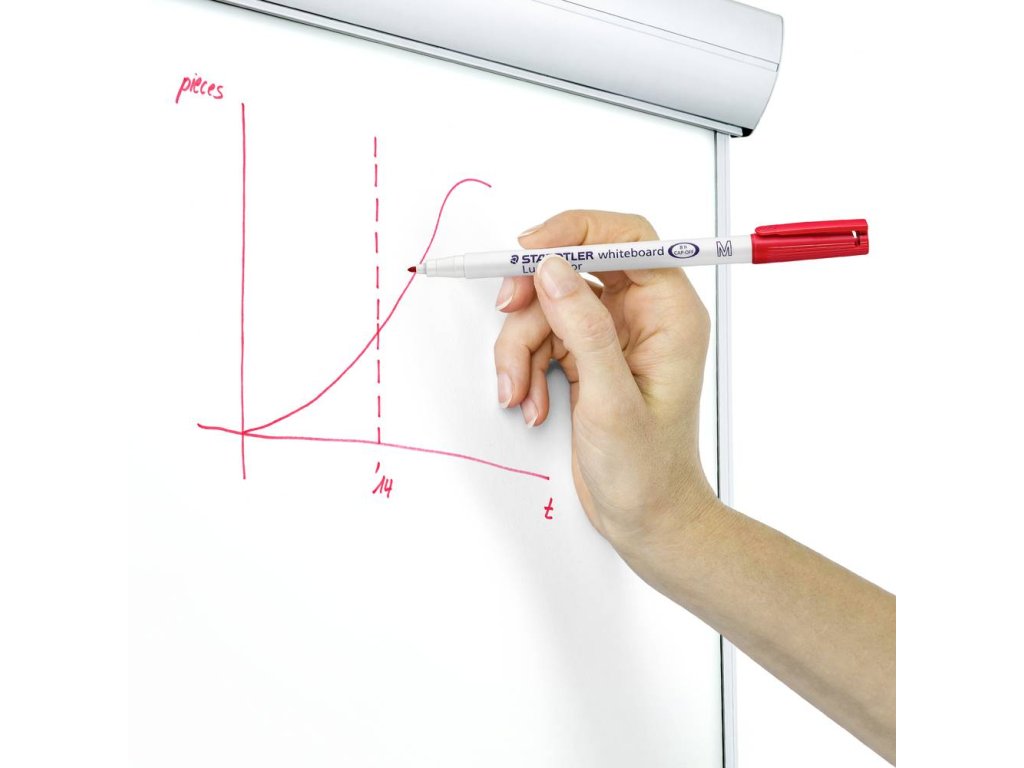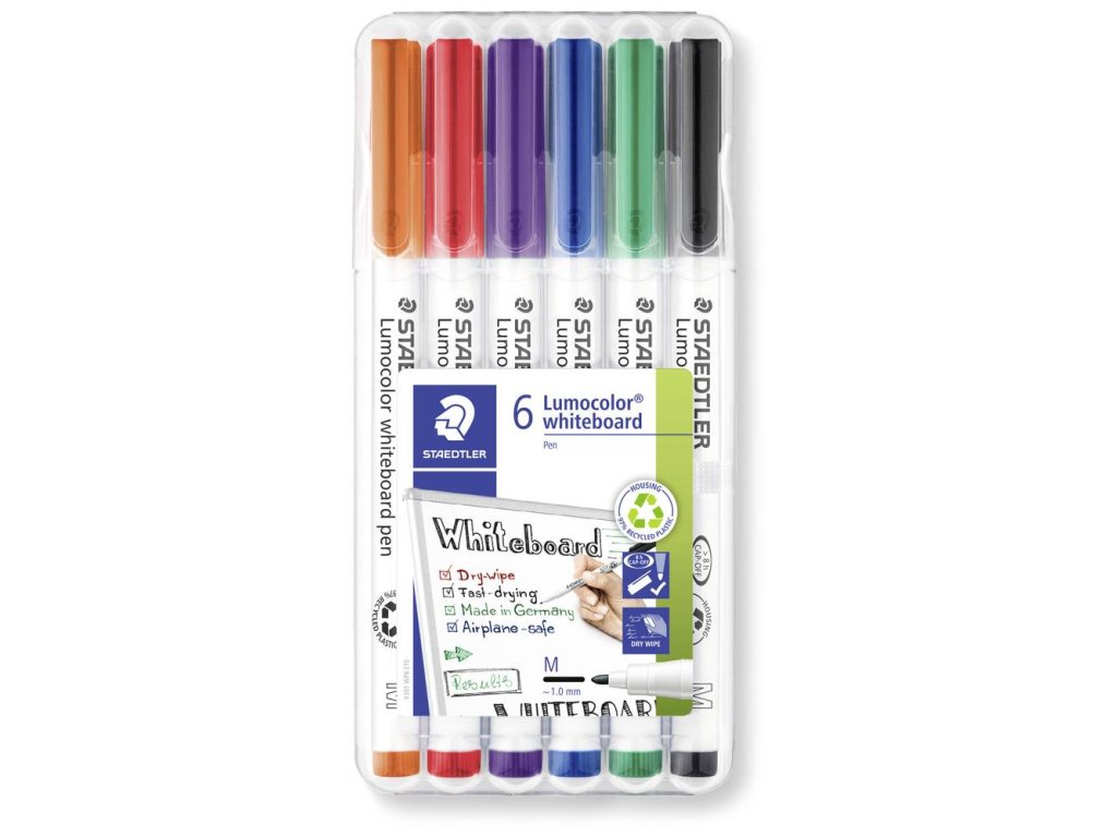 Staedtler Lumocolor 301 WP6 je popisovač na bílou tabuli v různých barvách se střední tloušťkou čáry (cca 1,0 mm) a kulatým hrotem. Inkoust je rychleschnoucí, nízkého zápachu, beze zbytků otíratelný a SAFE DRY, což znamená, že nevyschne ani po několika dnech bez víčka. Je také bezpečný pro letadla a je dodáván s klipem. Balení obsahuje 6 popisovačů v různých barvách.