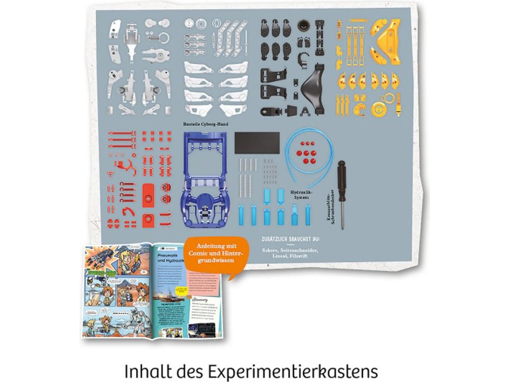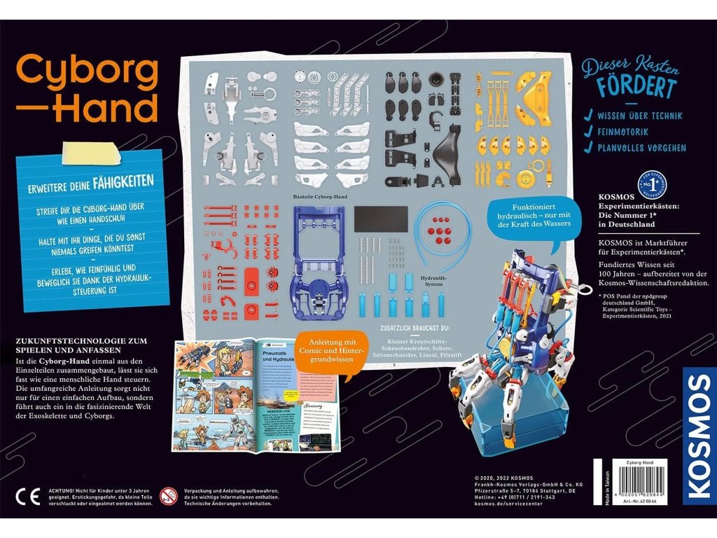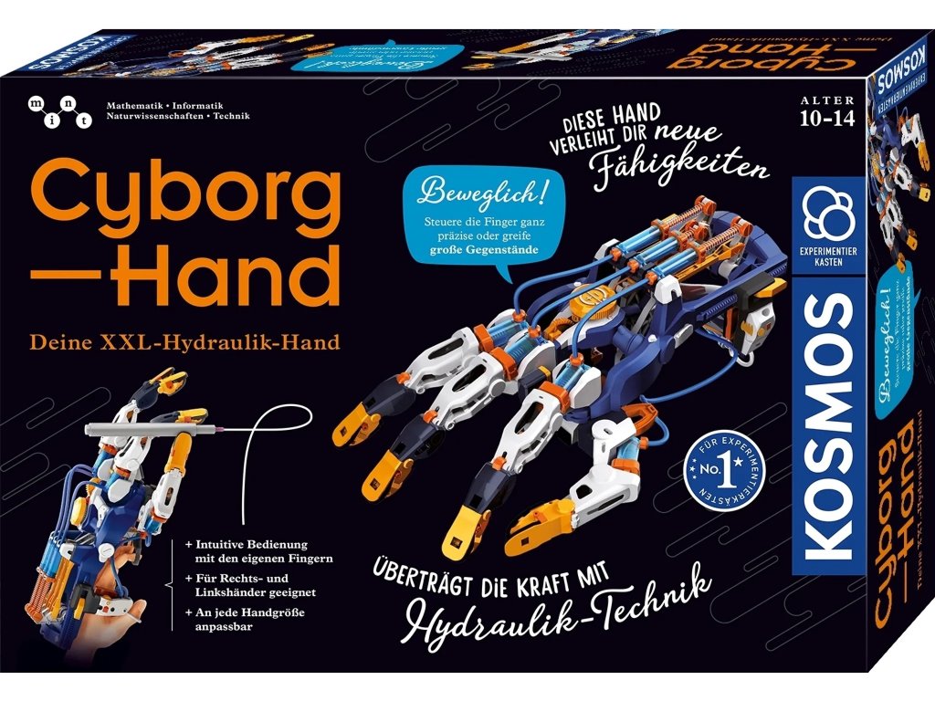 Konstrukce je navržena tak, aby byla univerzální pro praváky i leváky a přizpůsobila se jakékoli velikosti ruky. Bohatě ilustrovaný návod provází stavbou krok za krokem a je doplněn o zajímavé informace ze světa robotiky a moderní techniky. Tato kreativní sada rozvíjí motorické schopnosti, logické myšlení a technickou představivost dětí, které si díky ní mohou vyzkoušet roli inženýra i kyborgického operátora v jednom.