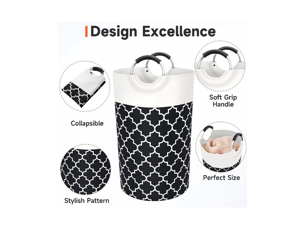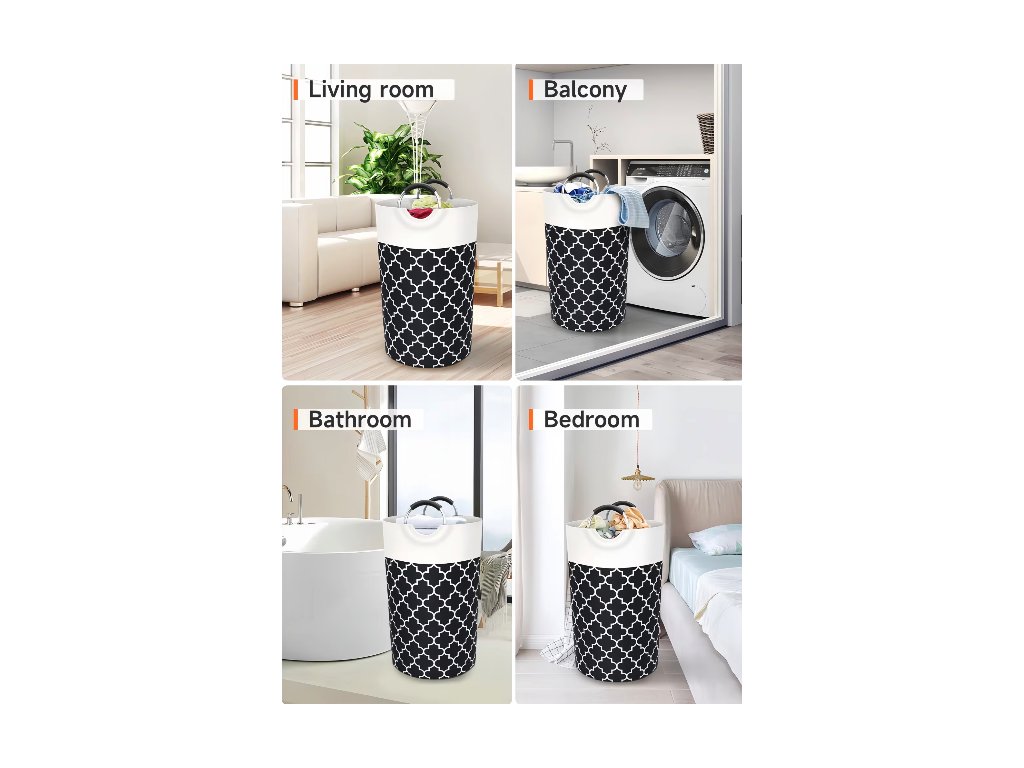 Praktický a stylový stojací koš na prádlo o rozměrech 74 x 38 cm nabízí velkorysý objem 82 litrů pro uložení vašeho špinavého prádla. Jeho bílo-černé provedení se snadno hodí do každé koupelny, prádelny nebo ložnice.