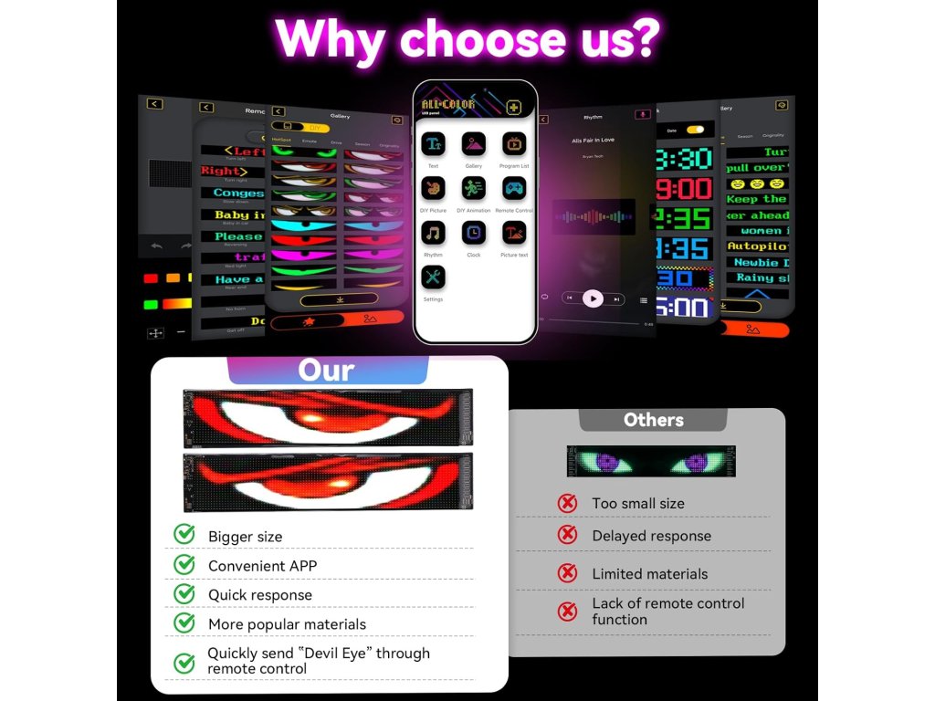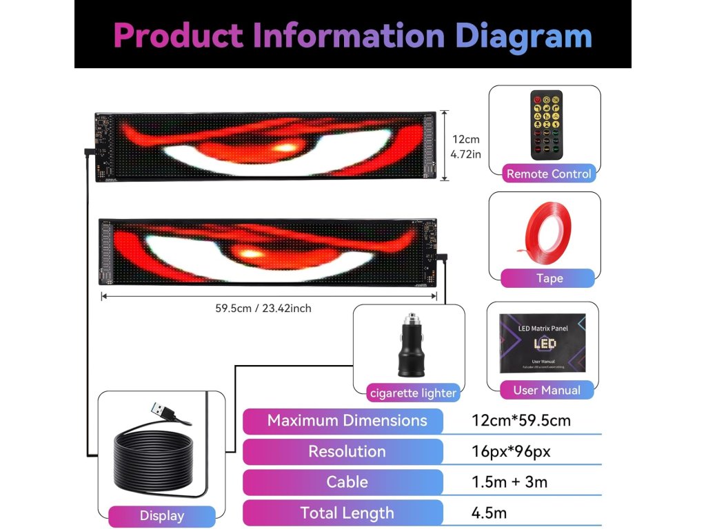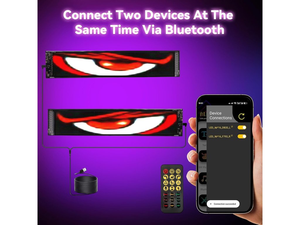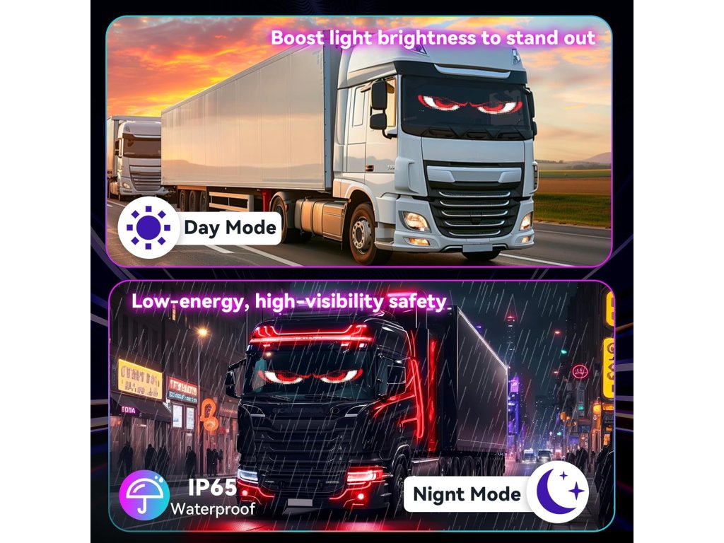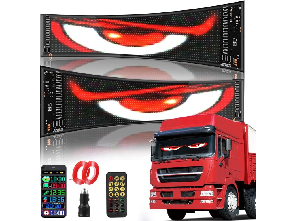Sada dvou flexibilních LED panelů s motivem "ďábelských očí" umožňuje zobrazovat dynamické animace, texty a grafiku na oknech automobilu nebo nákladního vozu prostřednictvím chytré aplikace.