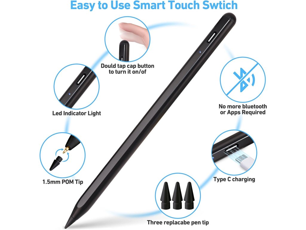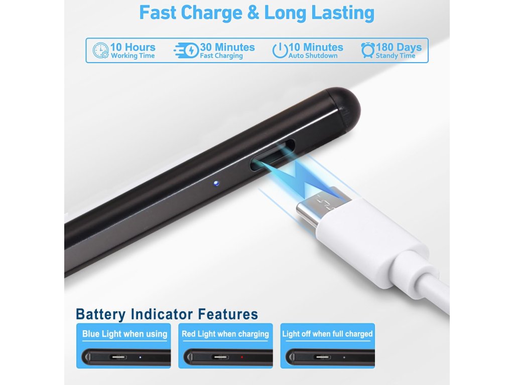 Tento aktivní stylus je ideálním doplňkem pro váš iPad (modely 2018-2022). Nabízí rychlé USB-C nabíjení a výdrž až 10 hodin. Disponuje funkcí odmítnutí dlaně pro přirozené psaní a kreslení bez rukavice a senzorem náklonu pro variabilní tloušťku čáry. Jeho 1.5mm POM hrot zajišťuje vysokou přesnost a plynulost bez zpoždění. Magnetické přichycení k iPadu usnadňuje přenášení. Není potřeba Bluetooth, stačí dvojitě klepnout pro zapnutí/vypnutí. Součástí balení jsou 3 náhradní hroty.