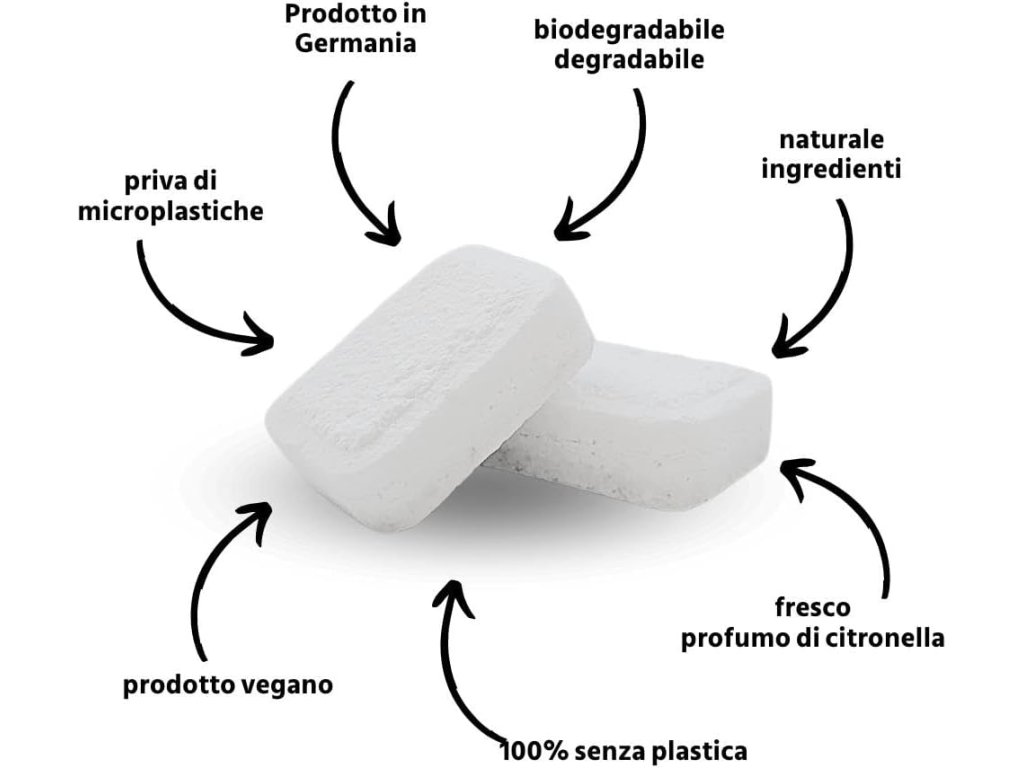 Tyto tablety jsou vyrobeny z biologicky odbouratelných a veganských složek, jsou 100 % bez mikroplastů a neškodí životnímu prostředí. Jsou baleny v udržitelné papírové krabici bez plastů. Tablety se během mytí zcela rozpustí a nezanechávají v myčce žádné zbytky. Jsou vhodné pro všechny typy myček. Pro optimální výsledky se doporučuje skladovat je na suchém a chladném místě. Produkt je vyroben v Německu.