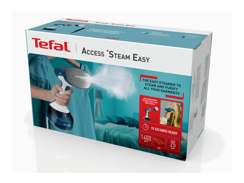 Kompaktní a výkonný ruční napařovač oděvů Tefal Access Steam Easy s příkonem 1400 W a výstupem páry 25 g/min. Rychlé nahřátí za 15 vteřin efektivně odstraňuje záhyby pachy a eliminuje až 99,9% virů a bakterií. Ideální pro rychlou a hygienickou péči o všechny typy tkanin.