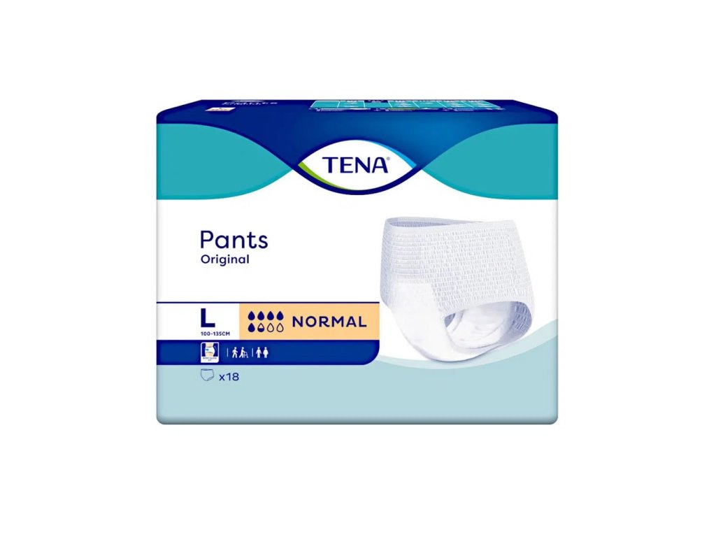 TENA Pants Original jsou inkontinenční kalhotky pro mírnou až středně těžkou inkontinenci, určené pro obvod pasu 100 až 135 cm. Balení obsahuje 18 kusů. Nabízejí trojitou ochranu proti únikům, zápachu a vlhkosti, jsou vyrobeny z měkkého a prodyšného materiálu a mají integrované bariéry proti úniku pro větší pohodlí a diskrétnost.