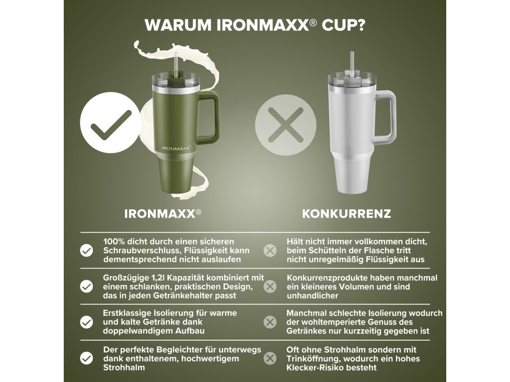 Užijte si své oblíbené nápoje v perfektní teplotě kdekoli s termokem IronMaxx o objemu 1,2 litru. Tento stylový a funkční hrnek v elegantní olivově zelené barvě je navržen pro maximální pohodlí a dlouhotrvající výkon.