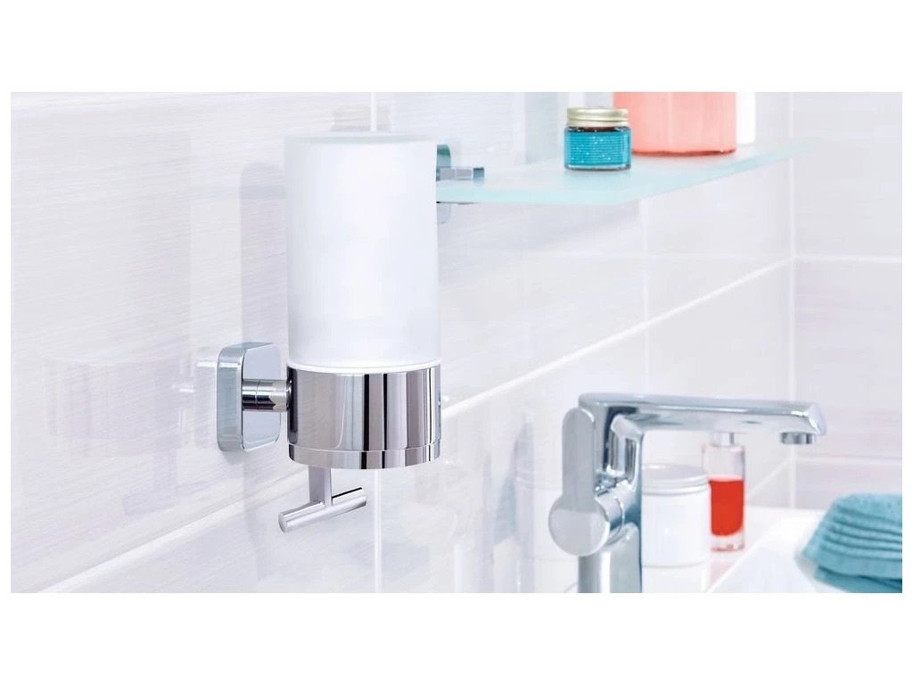 tesa® Elegaant dávkovač mýdla. Elegantní hranatý design, pochromovaný kov, matné sklo, montáž bez vrtání.