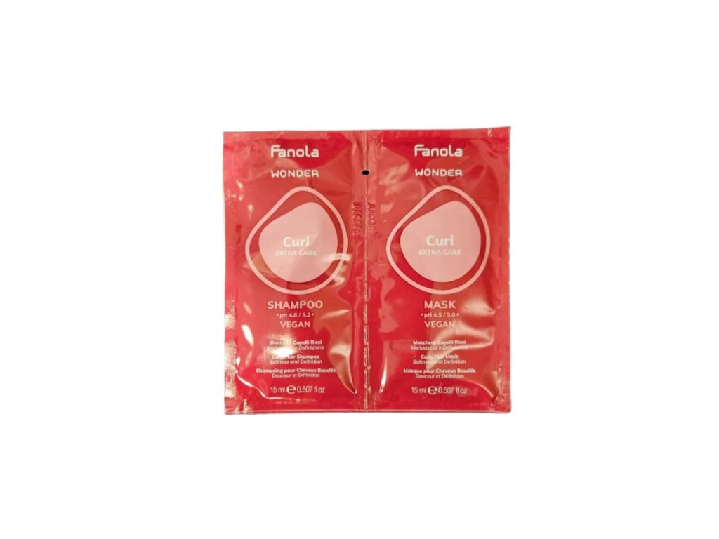 Tester Fanola Wonder Curl obsahuje šampon (15 ml) a masku (15 ml) speciálně vyvinuté pro péči o kudrnaté a vlnité vlasy. Šampon jemně čistí vlasy a zároveň je hydratuje, čímž pomáhá definovat a zvýraznit přirozenou texturu kudrlin. Maska intenzivně vyživuje vlasové vlákno, posiluje ho a dodává pružnost, čímž zabraňuje krepatění a usnadňuje rozčesávání. Produkty z řady Wonder Curl zanechávají vlasy hebké, lesklé a plné vitality s dokonale definovanými a pružnými kudrlinami. Toto zkušební balení je ideální pro vyzkoušení účinků řady Wonder Curl nebo na cesty.