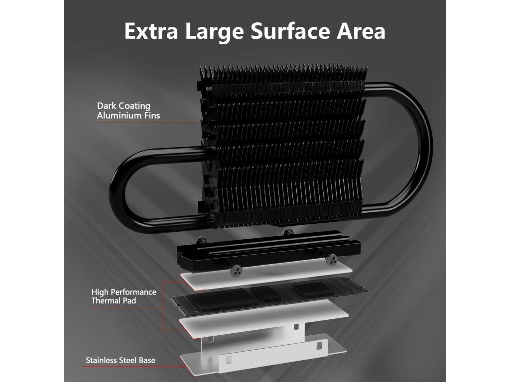 Thermalright HR-09 2280 PRO je vysoce výkonný chladič pro M.2 2280 SSD disky. Jeho unikátní nano termální podložka Advancing Gene je vyrobena z nano silikonové pasty s vynikající tepelnou vodivostí. Je dostatečně měkká a tvárná, aby se přizpůsobila nerovným povrchům SSD a její nízká viskozita nepoškodí záruční štítek SSD. Oboustranné chlazení zajišťuje hliníková slitina s drážkovaným designem, která výrazně zvětšuje chladicí plochu a dosahuje snížení teploty o 10°C - 30°C (v závislosti na prostředí), čímž chrání váš M.2 SSD před přehřátím a omezením výkonu. Chladič využívá pokročilou technologii druhé generace těsnění s tepelnou vodivostí až 14.8 W/m.K, celoplošný proces reflow pájení, pasivní žebra z čistého hliníku s galvanickou úpravou, základnu z čistého hliníku s galvanickou úpravou, dekorativní horní kryt z hliníkové slitiny a pevnou spodní stranu z nerezové oceli. Celková chladicí plocha činí 7500 mm². Technologie svařování jedné trubice s dvojitým uchycením přináší maximální účinnost chlazení. Instalace je snadná díky oboustrannému klipovému designu a šesti šroubům s nastavitelnou výškou, které jsou vhodné pro M.2 SSD různých výšek a zajišťují stabilní a bezpečnou montáž.