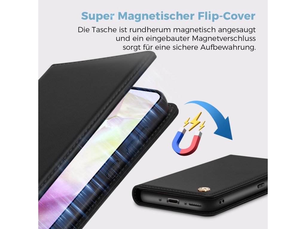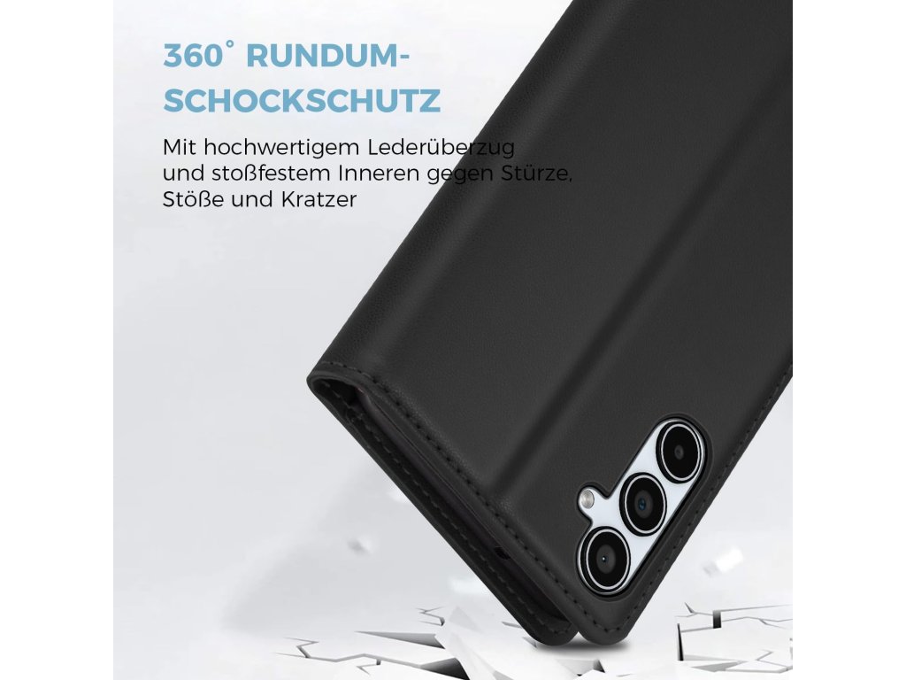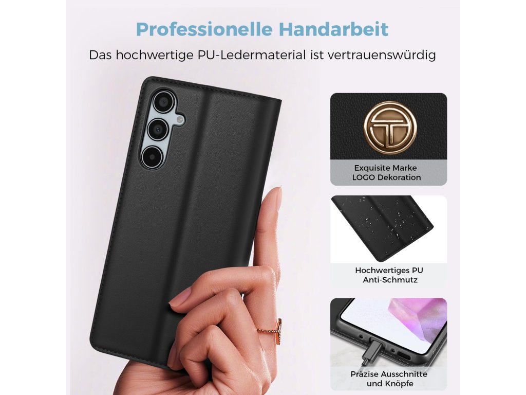 Premium černé kožené pouzdro Thorhülle pro Samsung Galaxy A35 5G kombinuje ochranu s funkcí peněženky. Je vyrobeno z kvalitní PU kůže a měkkého TPU, nabízí 3 sloty na karty a přihrádku na hotovost s RFID ochranou. Integrovaný skrytý stojánek umožňuje pohodlné sledování obsahu.