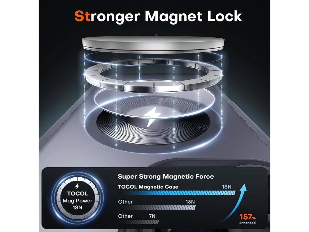 Pouzdro je vylepšeno pro magnetické nabíjení a je lépe kompatibilní se všemi magnetickými nabíječkami. Poskytuje stabilnější, kompatibilnější a rychlejší nabíjení. S magnetickou silou 18N (o 125 % vyšší než tovární standardy) zůstává magnetické přilnutí stabilní i na nerovných cestách.