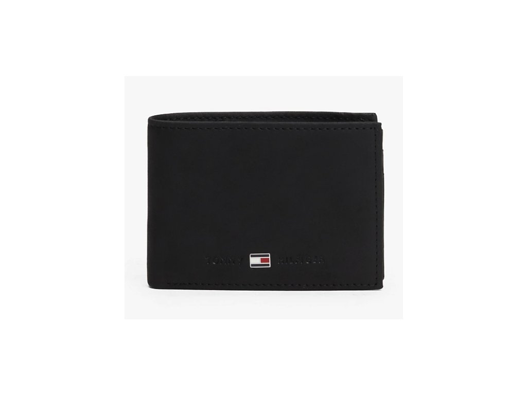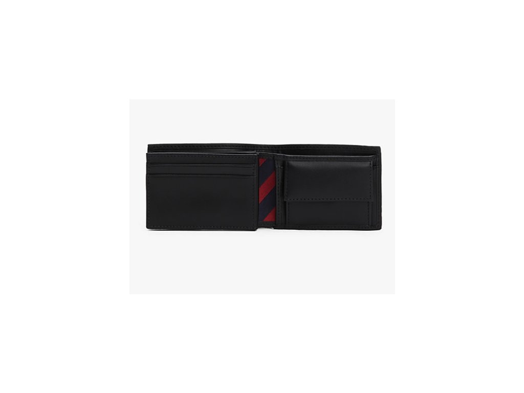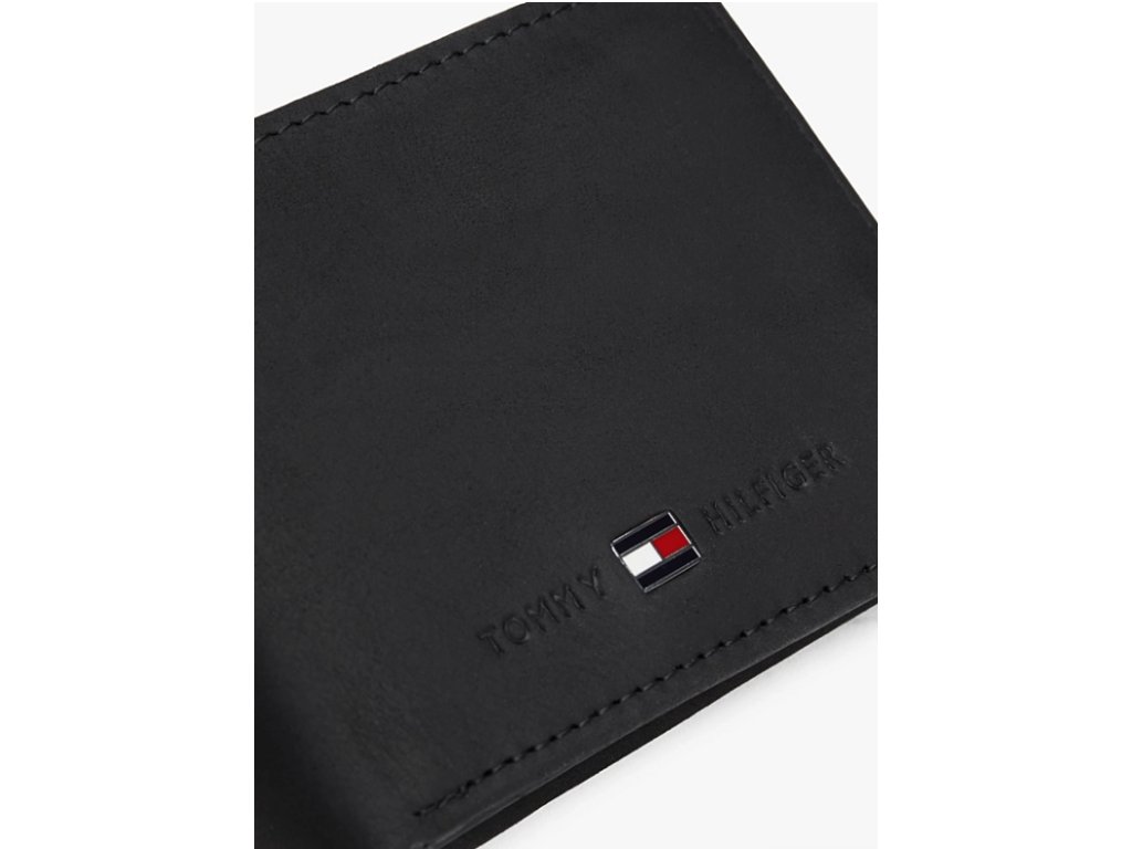 Tato malá peněženka je vyrobena z pravé kůže a je navržena tak aby se snadno vešla do kapes. Je v černé barvě a obsahuje přihrádky na bankovky sloty na karty a kapsu na mince se zapínáním na druk. Peněženka je zdobena embosovaným logem Tommy Hilfiger a kovovou vlaječkou značky.